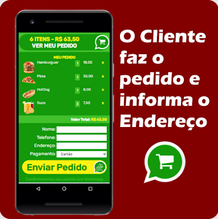 Seu cliente acessa a loja, Faz o pedido, Informa o endereço e você recebe o pedido no Whatsapp imediatamente.